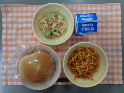 献立:米粉パン、スパゲティーミートソース、大根のごまネーズサラダ、牛乳