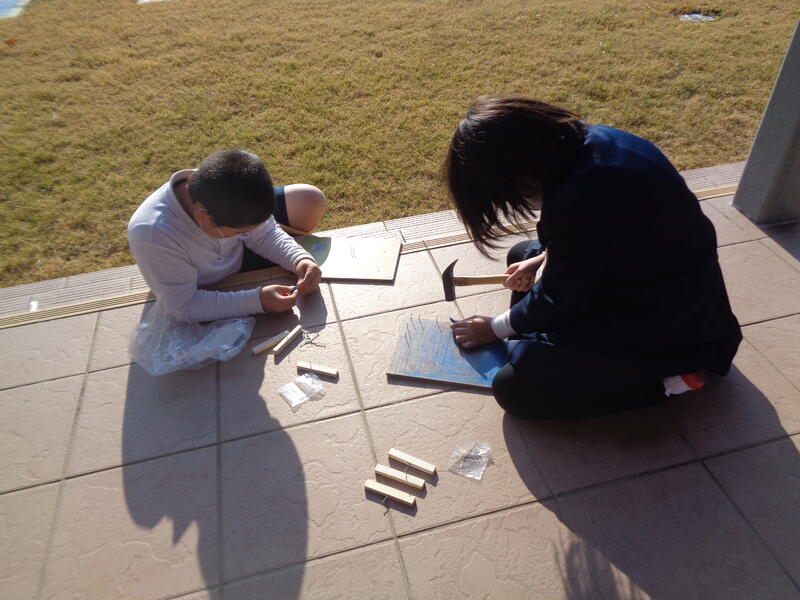 12月20日、寒い寒い日でしたが、日が差す渡り廊下はポカポカと暖かく、釘を打つトントンという音がリズミカルに響き、子ども達は「楽しい!」と夢中になって金づちを使っていました。