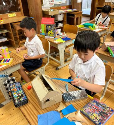 1年生は、図工「うきうきぼっくす」という学習で、空き箱を大変身させています。