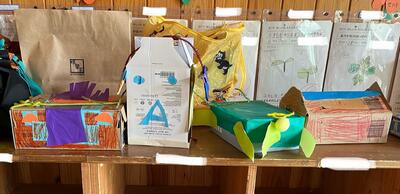 家庭で出た空き箱を持ち寄り、形や色や模様を生かして、工作していきました。