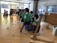 グループごとに自己紹介をした後、赤・白の2チームに分かれて玉入れをしました。この玉入れは、回転するので、相手の色のかごに入れると相手の得点になってしまいます。時間いっぱい集中して玉を投げ続ける姿が印象的でした。結果は1対1の引き分けで、嬉しさを分かち合うことになりました。