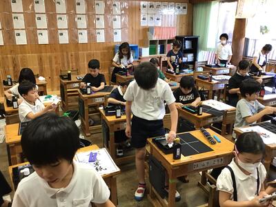 3年生から書写では「毛筆」に取り組みます。書く前から「汚れたらどうしよう・・」と墨で汚れることを心配している子供もいましたが、墨をこぼすこともなく、墨だらけになる子もなく、「習字道具を準備する」「筆を使って書く」「片付けをする」という第一関門を無事に突破しました。来週は、いよいよお手本を見ながら「二」を書きます。また、集中して取り組んでくれることでしょう。