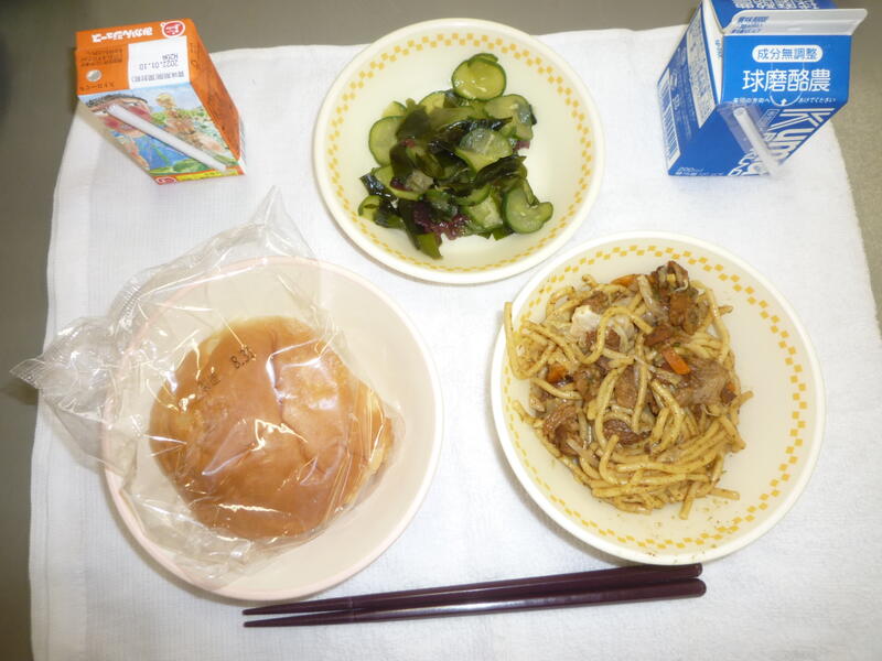 今日の献立は、 牛乳・ミニパインパン・海藻サラダ・焼きそば・ジューシー でした。