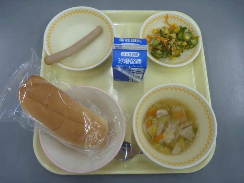 今日の献立は、コッペパン やさいのあったかスープ アーモンドサラダ ソーセージ 牛乳 でした。
