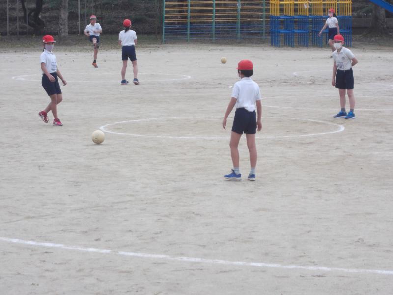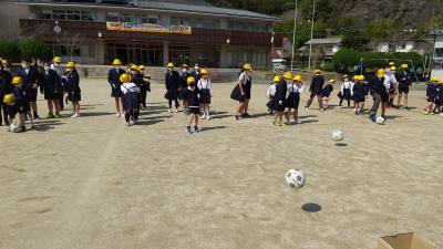 今日は初日として1年生との交流をしました。ボール的当てをしました。ボールをけって制限時間内に的に当てた回数で競います。当てても外しても優しい言葉がけを行い、みんな楽しんでいました。