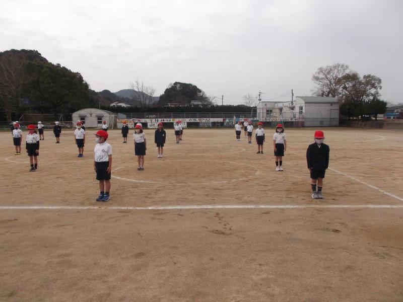 外に出てみると、間隔をあけて整列している児童の姿がありました。体育の学習中でした。