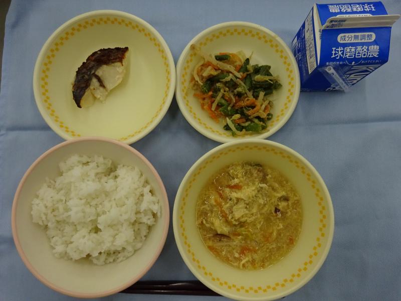 今日の献立は むぎごはん かきたまじる 魚のこうじやき いんげんのごまあえ でした。