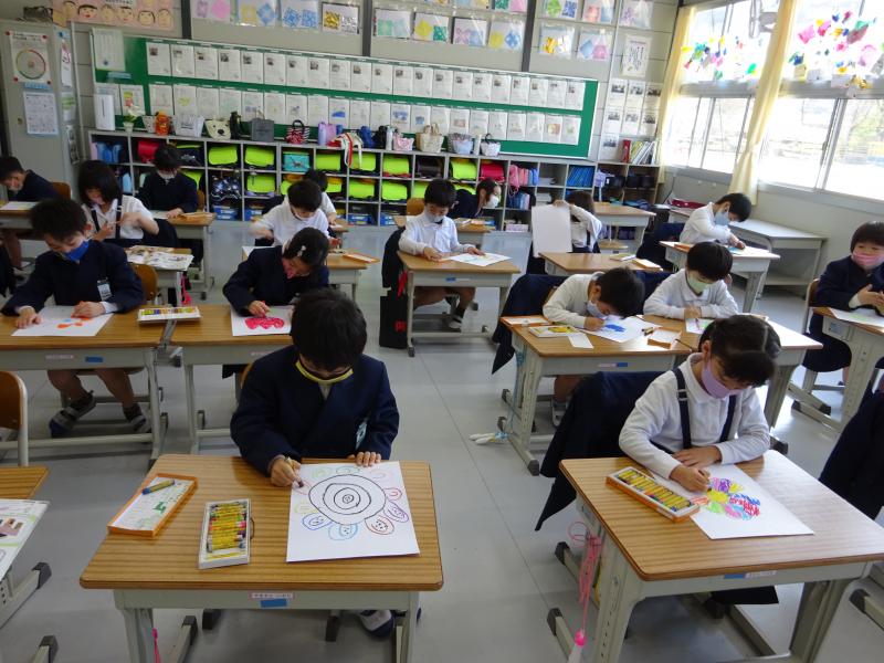 図工の時間に「こころのはなをさかせよう」の学習をしました。これは、新1年生に歓迎の気持ちを表すために心を込めてお花の絵を描こうというものです。1年生は、少しお姉さんお兄さん気分で、クレパスを使ってお花を描きました。