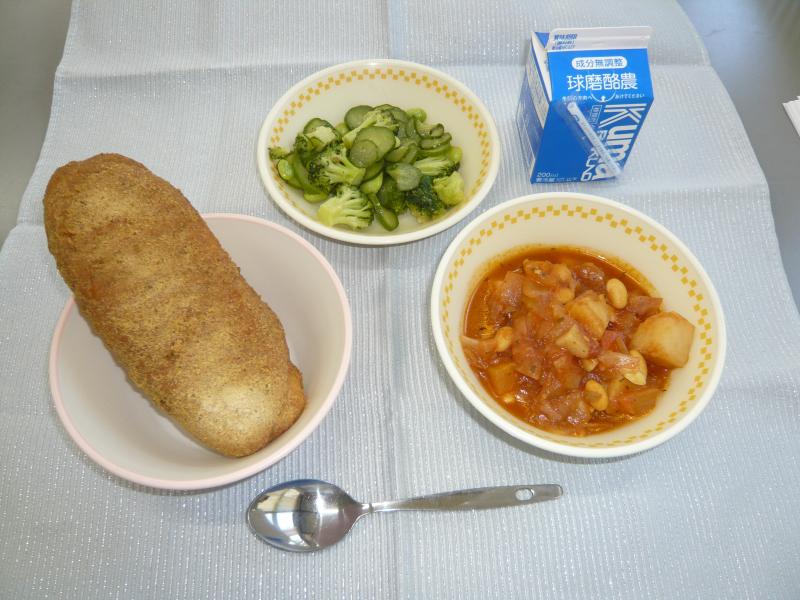 今日の献立は、「きなこあげパン、チキンビーンズ、イタリアンサラダ、牛乳」でした。