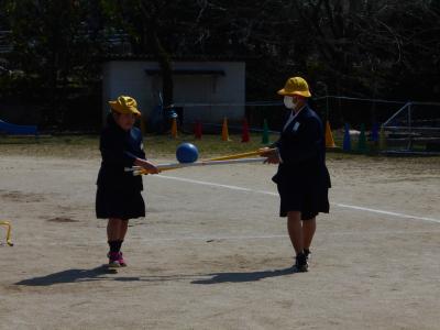 途中でボールが落ちそうになっても、6年生がうまくコントロールして3年生も無事に運ぶことができました。