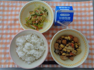 献立:麦ごはん、大豆の磯煮、キャベツの梅和え、牛乳