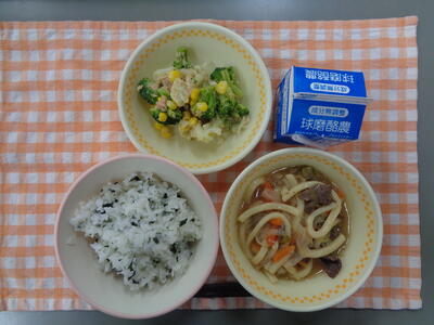 献立:わかめごはん、肉うどん、冬野菜のごまだれ、牛乳