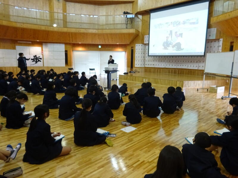 先週の10日(金)にカンボジア講演会を実施しました。今回の講師は、佐敷小保護者の木ノ下さんです。木ノ下さんは、カンボジアへ学校をつくる運動に小学生のころから参加し、実際に最初の校舎が出来上がるときにカンボジアの学校を訪問しました。その時の体験を中心に小学生の時のことや、現在の仕事などについて話していただきました。特に、カンボジアでの出来事には心を動かされました。今回、当たり前のように取り組んでいるカンボジアでの学校建設に向けたチャリティーバザーや募金について考える機会になったと思います。これからも一人一人の子供がカンボジアや世界のことを考えながら、カンボジアへの学校建設に携わってほしいです。