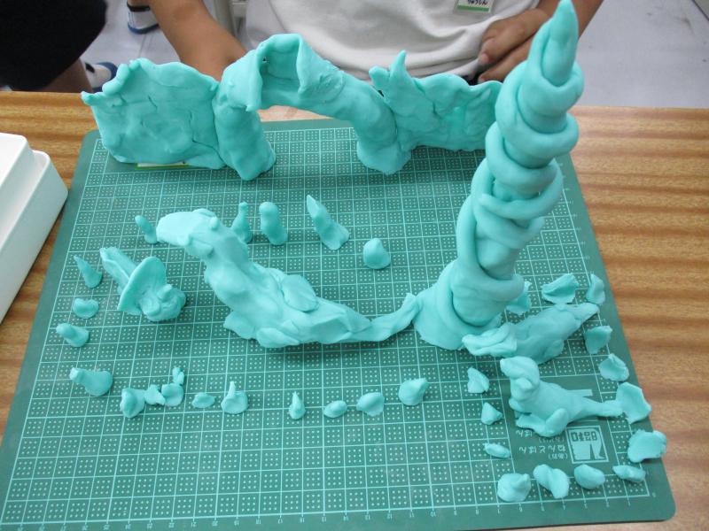 図工の時間に「粘土ランドへようこそ」という学習をしました。つまむ・ひねる・丸める・のばす・積み重ねるなどの「技」を使い、自分で決めたテーマに合う「〇〇ランド」を作りました。作りながらどんどんアイディアが浮かぶようで、動物・花・ブランコ・恐竜・タワーなどができあがっていき、3年生の教室に楽しい世界と笑顔がいっぱいに広がりました。