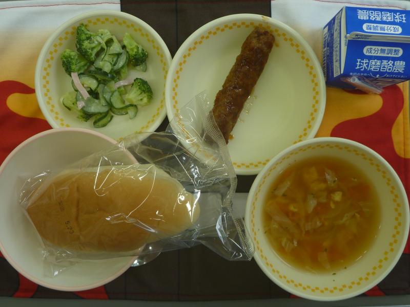 今日の献立は、コッペパン、トマトと卵のスープ、シーザーサラダ、スティックドッグ、牛乳でした。