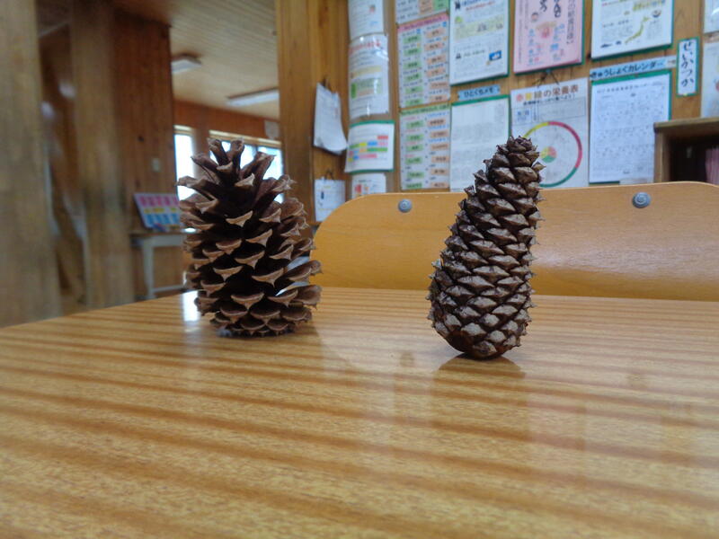 「まつぼっくり」を水で濡らしたらどうなるか。乾いているものと比較しました。(写真)
