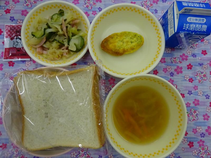 今日の献立は、食パン・ポテトスープ・ほうれん草オムレツ・さらたまサラダ・マーシャルビーンズ・牛乳でした。