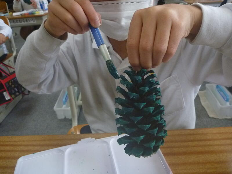 11月14日に大野小学校へ出かけてみんなで松ぼっくりを拾ってきました。生活科の時間に、その松ぼっくりを使って、ツリーを作り始めました。今日の作業は、松ぼっくりへの色塗りです。緑色の絵具を絵筆で松ぼっくりの全面にていねいに塗り、金色の粉も所々に筆で付けました。次の生活科の時間には、ツリーに飾りを付けます。出来上がったツリーは、保育園児を招いての「わくわくまつり」で、プレゼントする予定です。