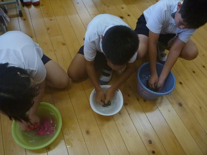 家庭科で「洗濯の仕方」を学習しました。まず、水や洗剤の量を測って洗濯液を作り、くつ下のかかとやつま先の部分をもみ洗いしました。もみ洗いした後は、水を取り替えながら3回すすぎ、しっかり絞って洗濯物干しに吊り下げたり、板の上に広げたりして乾かしました。次の日に乾いたくつ下を教室の中へ取り込みましたが、どのくつ下もとてもきれいになっていました。これからは、自分のくつ下は自分で洗えそうです。