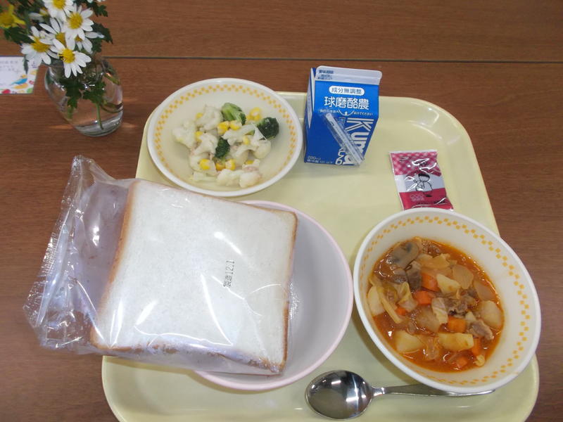 今日の給食は、食パン、ボルシチ、冬野菜のサラダ、マーシャルビーンズ、牛乳でした。