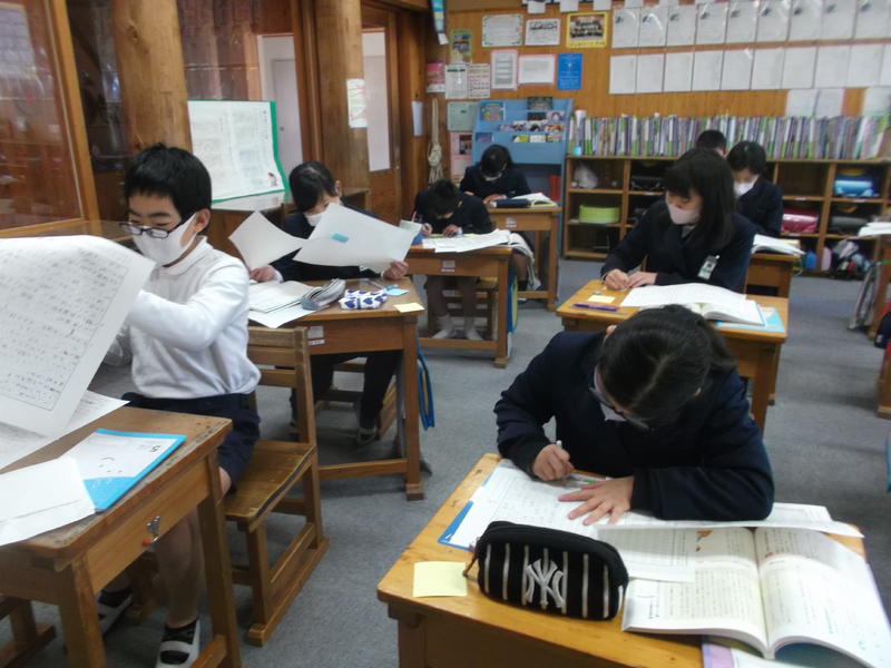 5年1組は、国語の時間に書いた意見文を互いに推敲し、まとめていました。