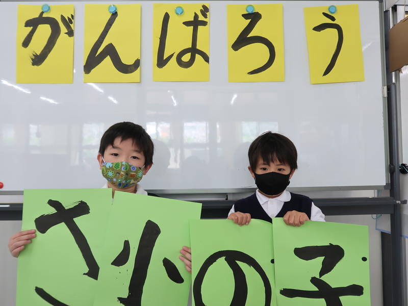 習字教室に通っている一年生の二人が、墨に思いを乗せて「がんばろう さ小の子」と力強い字を書いてくれました。一年生は、毎日すこしずつ漢字の練習をしていますが、「『さ』と『の』が難しかった。」「楽しく書けた。」と話をしていました。プレハブ校舎の昇降口に掲示していますので、来校された際は是非ご覧ください。