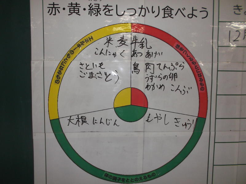 毎日、給食委員会の児童が、本校舎と仮設校舎に用意されたボードに、それぞれの食品を三大栄養素に分けて記入し、健康な体つくりを呼びかけてくれています。