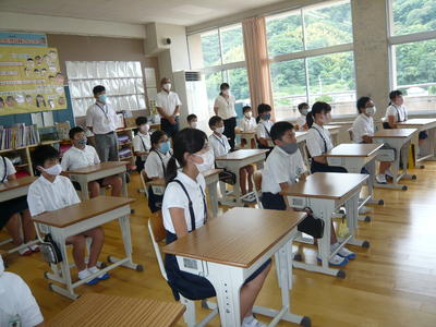 短い夏休みが終わり、いよいよ2学期が始まりました。2学期の始業式も1学期の終業式と同じように、校長先生が各教室を回る分散型で実施しました。式の前に、新しくスクールサポートスタッフとして着任された山口和代先生の紹介がありました。教室内の消毒やプリントの印刷などの業務をしていただきます。
