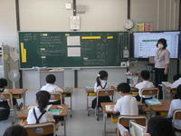 仮設校舎生活2日目。今日の3校時(算数)の1年1組の様子です。