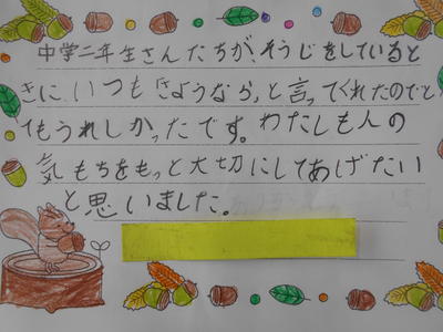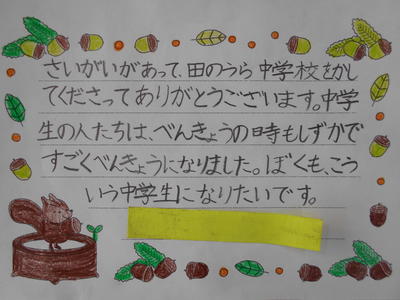 今週は「感謝の週」ということで、「自分たちのできることを一生懸命にがんばろう」を合言葉に生活してきました。中学生と生活することで、多くのことも学ぶこともできました。この貴重な経験を今度は佐敷小学校に戻ってからいかして励んでいきたいです。中学生へのお礼のメッセージの一部を紹介します。