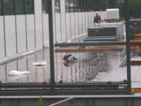 今日も早朝から工事が始まりました。基礎部分はほぼ整い、鉄骨を組み立て壁面部分が取り付けられていました。