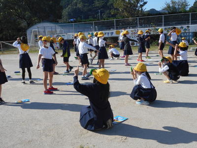 さわやかな秋空のもとで、自分のかげと遮光板を用いて太陽の位置の関係を調べました。