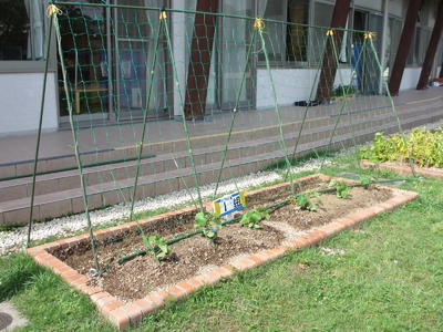 ミニトマトの苗です。きゅうりと同様に鮮やかな緑色で、お日様の光をたっぷり浴びています。