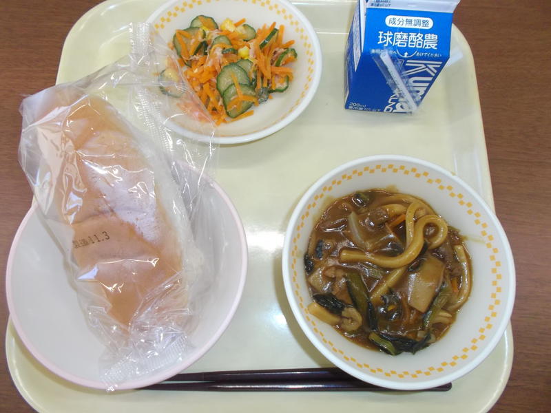 そんな子どもたちの学校生活を支えている給食の今日のメニューは、ミニコッペパン、カレーうどん、にんじんサラダ、牛乳の4品でした。