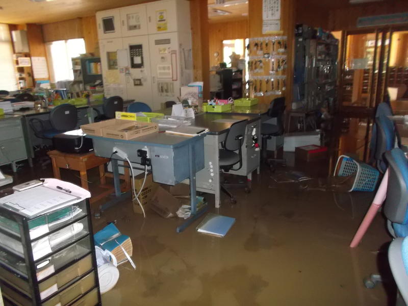 職員室(コンセントが水没し、ICT機器が使用できず機能停止の状態に・・・)