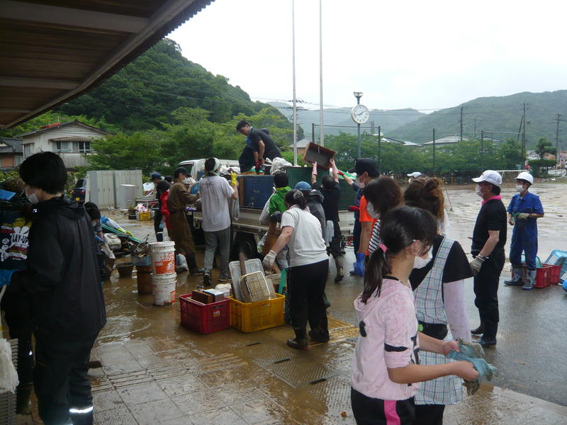 今日も雨。復旧作業が思うように進まない中、多くのボランティアのみなさんの力を借りて、普通教室棟と特別教室棟の1階部分の整理に当たりました。