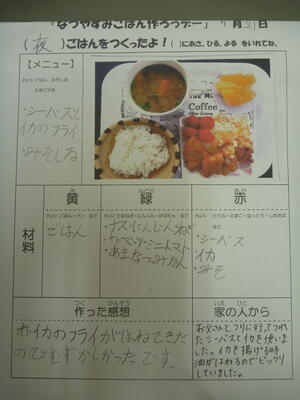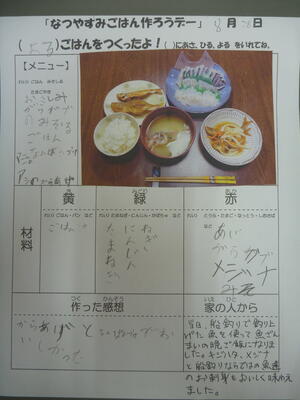 今回は夏休みということもあり、朝食に限らないということと2枚のカードを配らせてもらいました。少しずつ子どもたちの腕が上がっていることに微笑ましく思ったところでした。保護者の方には、お忙しいところ取り組んで頂き大変ありがとうございます。子どもたちの健康な食生活のためにも、これからもどうぞよろしくお願いいたします。