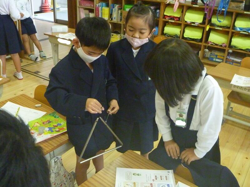 音楽では、トライアングルを使って、音を探しました。「チリリリリーン」「カーンカーン」など、叩き方で聞こえ方も違うことに気付いていました。友達と協力しながら楽しく学習できました。