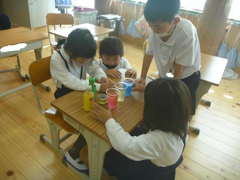 10月になって少しずつ寒くなってきていますが、1年生はほとんど欠席もなく、元気に学習しています。算数では、「どちらがおおい」という学習をしています。水の量の比べ方を考えたり、確かめたりする学習です。友達と協力しながら仲良く活動していました。