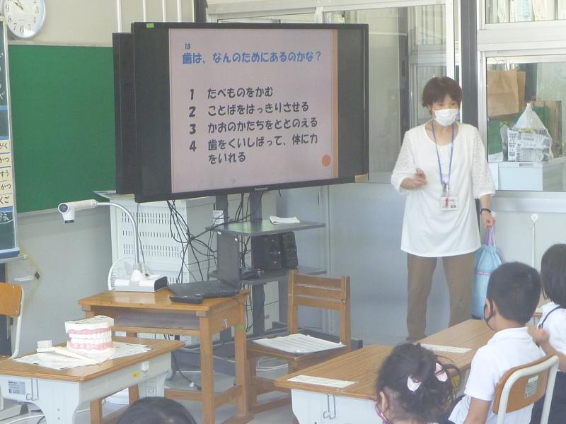 学活の授業で養護の小﨑先生に入っていただき、歯磨きの大切さについて学習しました。学習後には