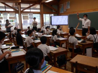 本校では、「食」をテーマにした取組を昨年度から行っています。これまで日々の給食や授業、または家庭と連携を図りながら「お弁当作り」「朝食(みそ汁)作り」にさまざまな活動を行ってきました。今回授業の中で、5年生が「食」をテーマにした俳句作りに挑戦しました。5・7・5の表現には慣れ親しんでいる子どもたちですが、「言葉をよりすぐって作ろう」というめあてに向かって言葉を選んだり、季語を考えたりしながら自分なりの表現を楽しんでいました。「バーベキュー」「新米」「夕ご飯」と自分の食との繋がりを思い浮かべる温かい時間になりました。たくさんの先生方に囲まれた授業でしたが、自分の考えを活発に発言する子どもたちの姿が見られました。