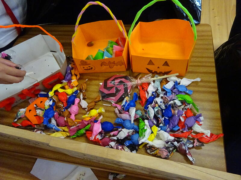 また、学活では「ハロウィンパーティーをしよう」ということで、お店屋さん風にしてみんなでどんぐりごまや松ぼっくりのけん玉ゲームを楽しむとか、「Trick or Treat」ではなく、自分たちで紙で作ったお菓子を交換したり、日頃お世話になっている先生方に手紙とお菓子を一緒に渡すとかの計画を立て、パーティー当日に向けて準備をがんばってきました。
