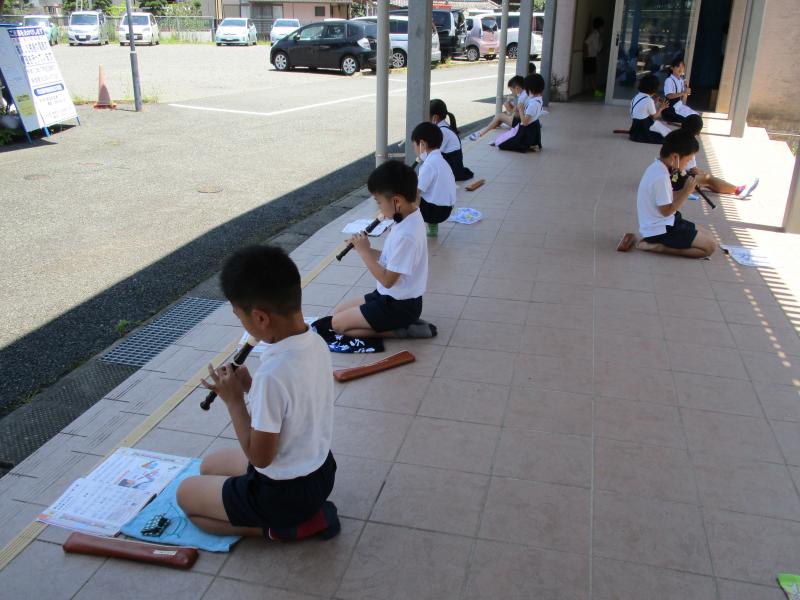 音楽では、体育館そばの通路に並んでリコーダーの練習をしました。家で毎日5分練習するという課題に真面目に取り組み、とてもきれいな音が出せる子が多くなりました。吹く時の姿勢もばっちり!?