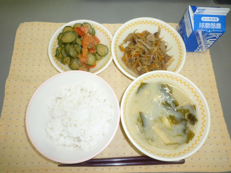 今日の献立は、 牛乳・むぎごはん・とうふのみそしる・トマトのごまだれ・豚肉とごぼうのピリ辛炒め でした。