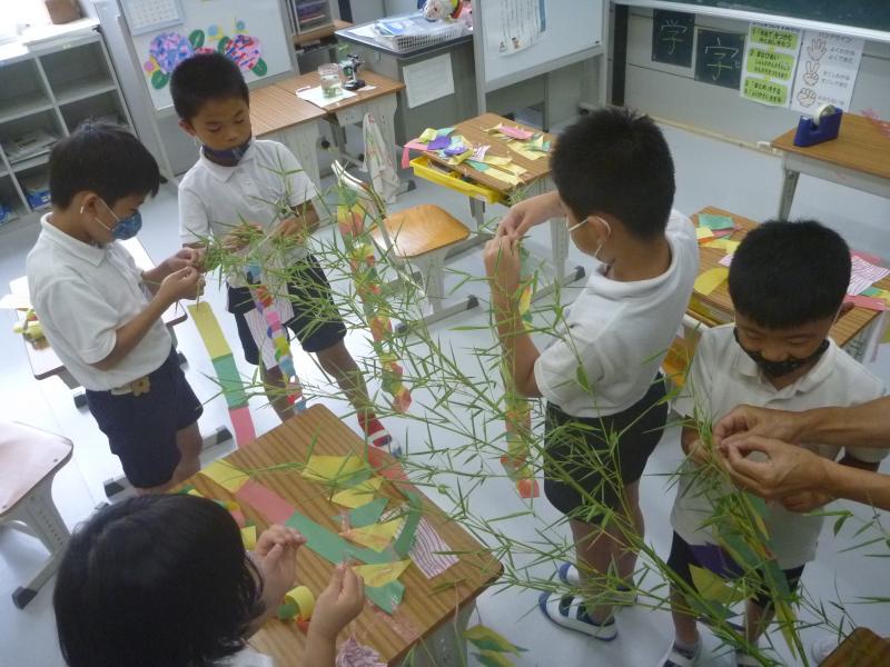 なかよし1組で七夕飾りを作って笹竹に結びつけました。7月に入ってから少しずつ、三角つなぎ、四角つなぎ、ひし形つなぎ、輪つなぎなどを作って準備していました。7月5日に「新型コロナが早くおさまりますように。」「みんながけがをしないですごせますように。」「みんながなかよくすごせますように。」など、自分だけでなくみんなのための願い事を考えて書きました。7月7日に、1時間かけて笹に飾りを結び付けました。みんなの願いが七夕星に届くことを祈ります。