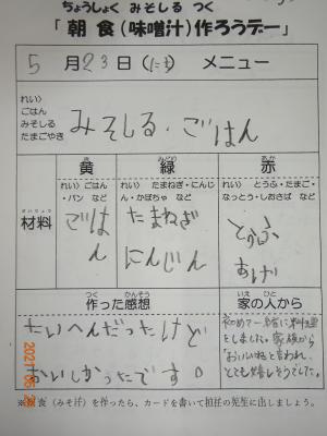 5月 朝食(味噌汁)作ろうデー 投稿日時 : 2021/05/28 投稿者4 朝食作りにご協力ありがとうございます。子どもたちが少しづつ料理に興味をもち、できることが増えているようで頼もしく思います。 Tweet {{options.likeCount}} {{options.likeCount}} {{options.unlikeCount}} {{options.unlikeCount}} 0 コメント