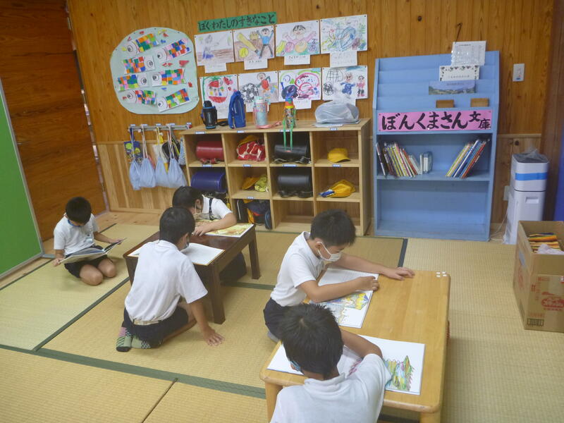 昨年7月の豪雨災害の被災者支援として、「ぼんくまさん」という支援グループより、本を34冊寄贈して頂きました。なかよし1組には本が一冊もありませんでしたので、学級文庫として、34冊の本をもらい、「ぼんくまさん文庫」と名付けました。恐竜の絵本・鬼の絵本など、楽しい本がいっぱいあり、興味津々でページをめくっています。大切に使います。