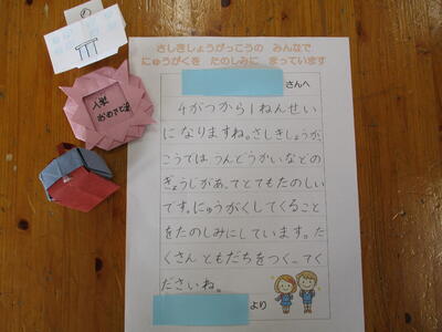 2月も今日で終わり、明日からいよいよ3月になります。例年この時期は入学してくる新一年生のために、体験入学で校舎内の案内や仲良くするための活動を5年生が中心となって行うのですが、本年度は入学してくる子どもたち一人一人にお祝いのメッセージと折り紙のプレゼントを心を込めて用意しました。