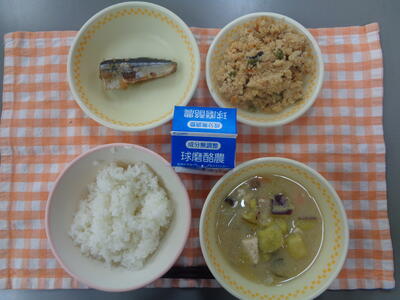 献立:ご飯、さつまいもの味噌汁、さんまのみぞれ煮、炒り卯の花、牛乳