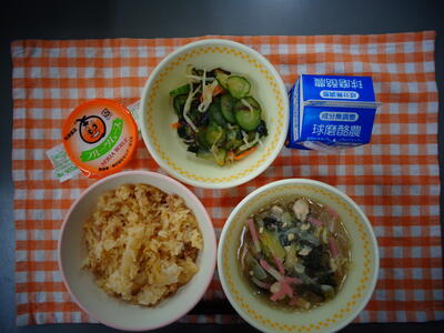 献立:ぶたキムチごはん、はるさめスープ、かいそうサラダ、フルーツムース、牛乳